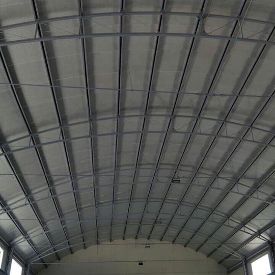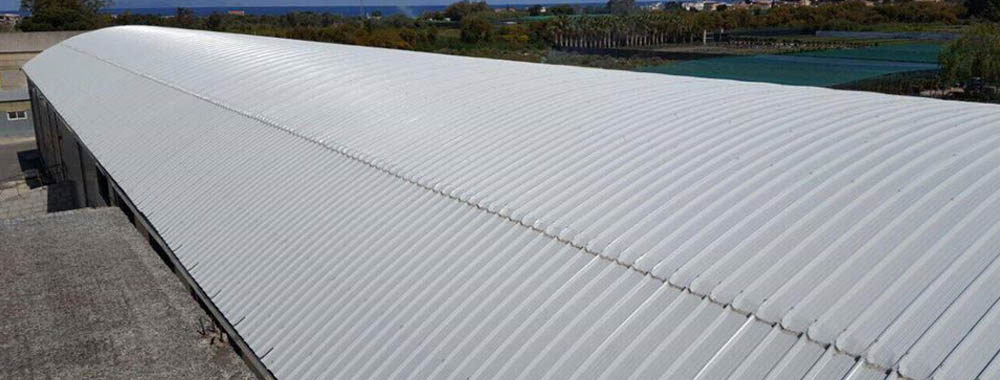 La copertura (curva) è realizzata con un pannello 5 greche in alluminio, esterno bianco grigio, interno a vista goffrato (sempre in alluminio).